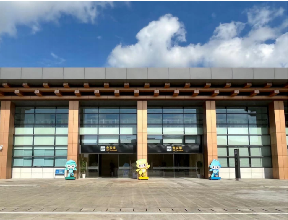 舟山普陀山国际机场祥云贵宾楼于2024年1月26日正式启用,位于国内候机楼北侧,建筑面积为5137平方米,总高度为16.02米。为一层半式布局,贵宾区在一层。陆侧与贵宾停车场相连,空侧以连廊与国内航站楼相连,离港以摆渡车与飞机泊位相接。